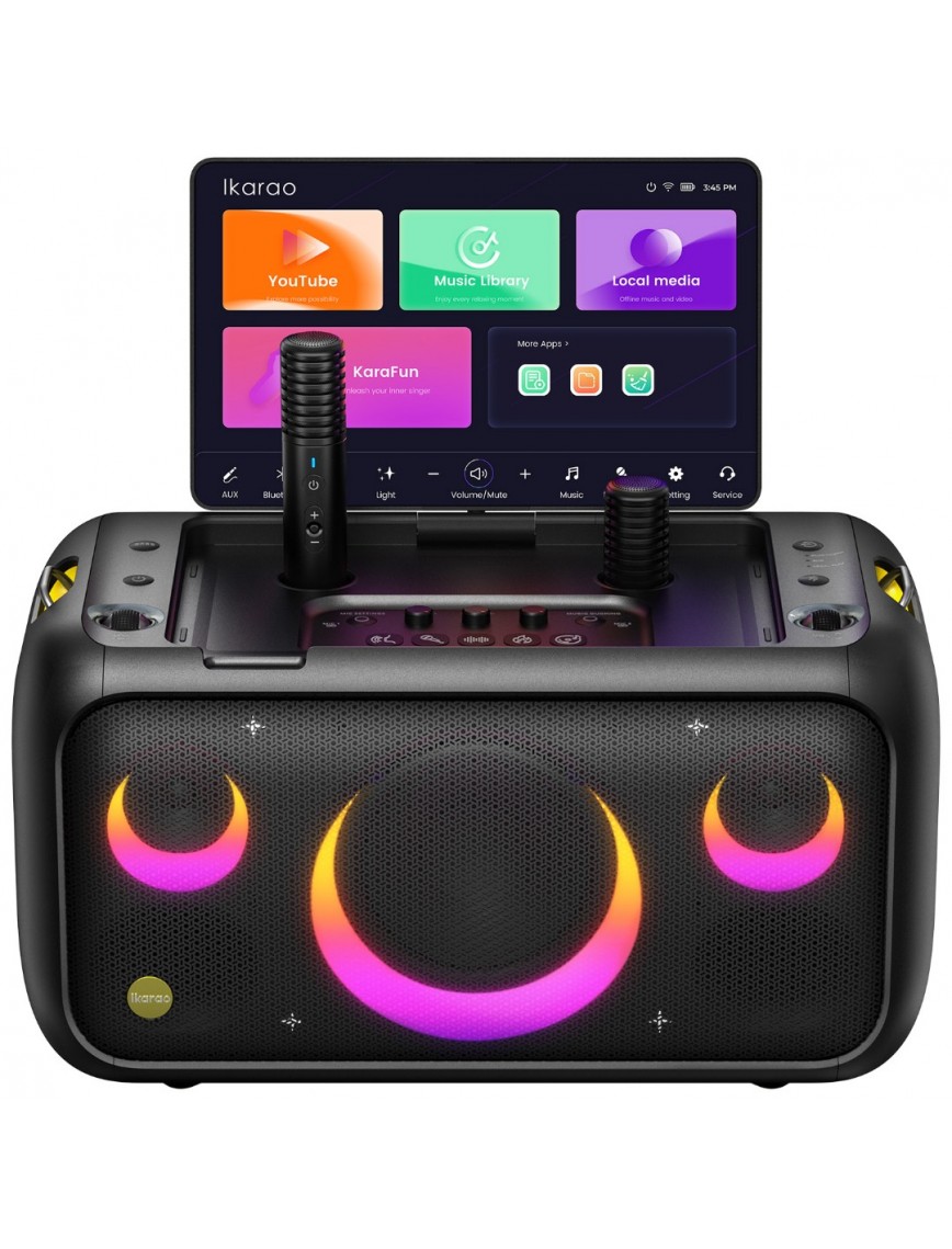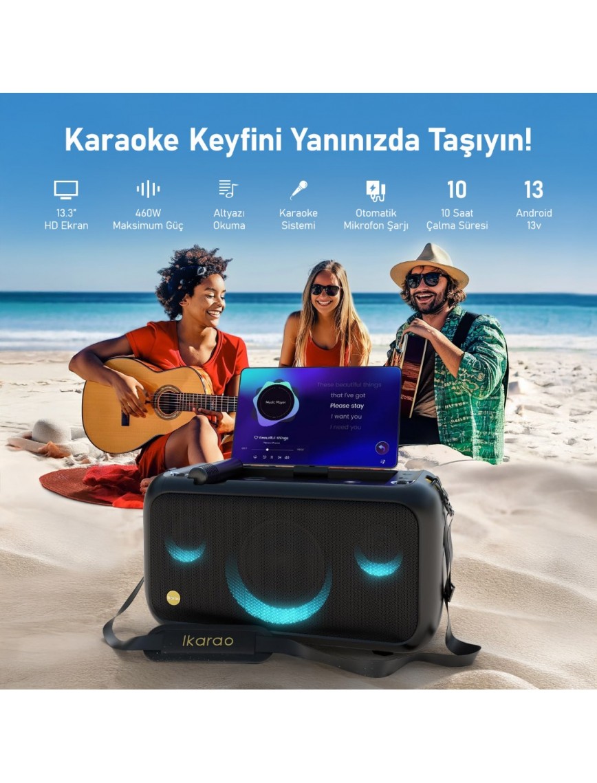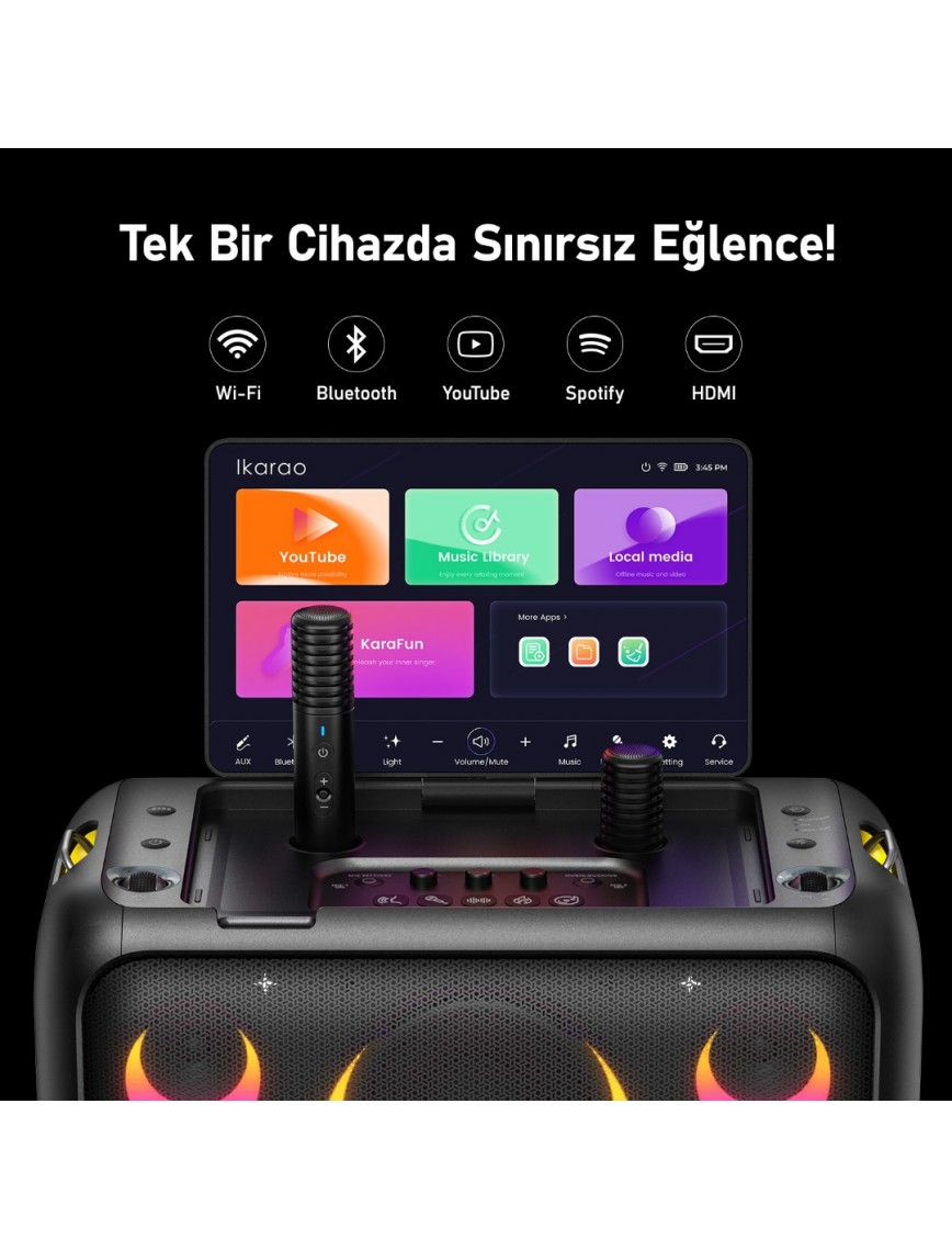 Ikarao Partybox Break X1 460W Karaoke Bluetooth Hoparlör Seti, 13.3" Dahili Tablet, 2 Kablosuz Gizlenebilir Otomatik Şarjlı Mikrofon, RGB Işıklı Taşınabilir Karaoke Ses Sistemi ve Ses Bombası