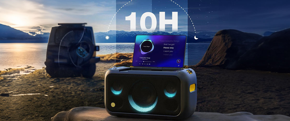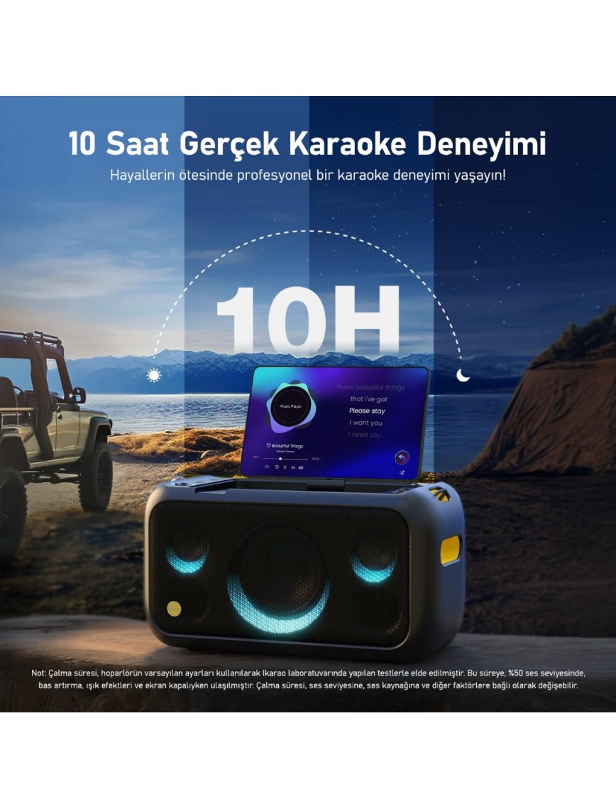 Break X1 Karaoke Hoparlörü, ekran açıkken 6 saat, ekran kapalıyken 10 saate kadar kesintisiz eğlence sağlar.