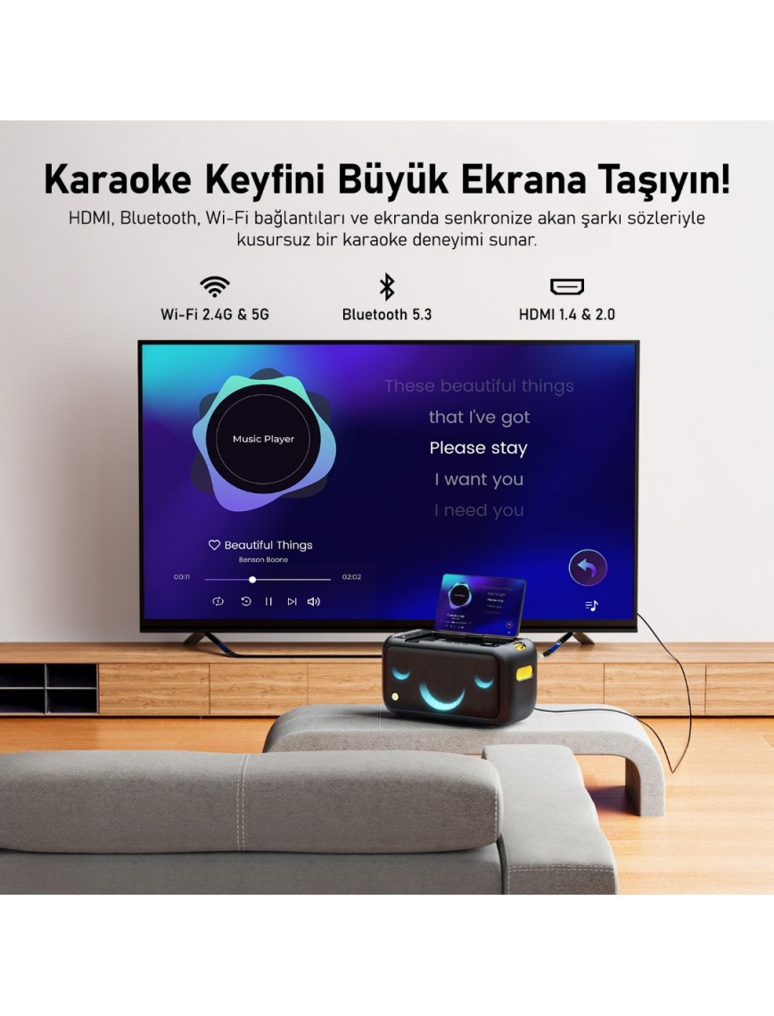 Spotify, YouTube, KaraFun gibi uygulamalar üzerinden HDMI, Bluetooth ve WiFi aracılığıyla televizyonunuza bağlanarak tam bir karaoke deneyimi yaşayın.