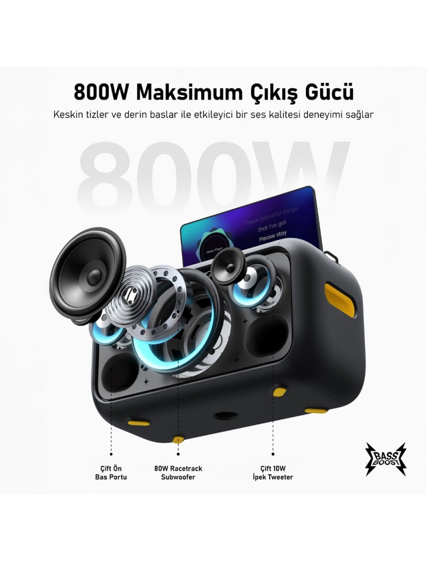 Ikarao Break X1 Karaoke Bluetooth Hoparlör, 460 watt ses çıkış gücüyle dikkat çeker. 6,5 inç woofer ve 2 x 2,6 inç tweeter ile donatılmış olan bu hoparlör, 107 dB SPL ve 45 Hz-20 kHz frekans aralığında güçlü, kristal netliğinde ses sunar. Karaoke partilerinden açık hava etkinliklerine kadar her ortamda üstün ses performansı sağlar.