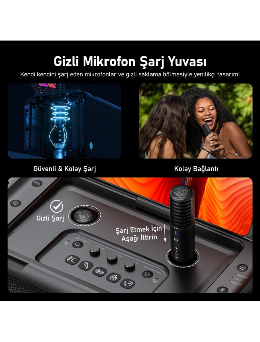 Yenilikçi mikrofon yuvası sayesinde mikrofonlarınızı takılı haldeyken otomatik olarak şarj edebilirsiniz ve saklayabilirsiniz. USB portu, powerbank görevi görerek akıllı telefon, tablet gibi cihazlarınızı şarj edebilir.