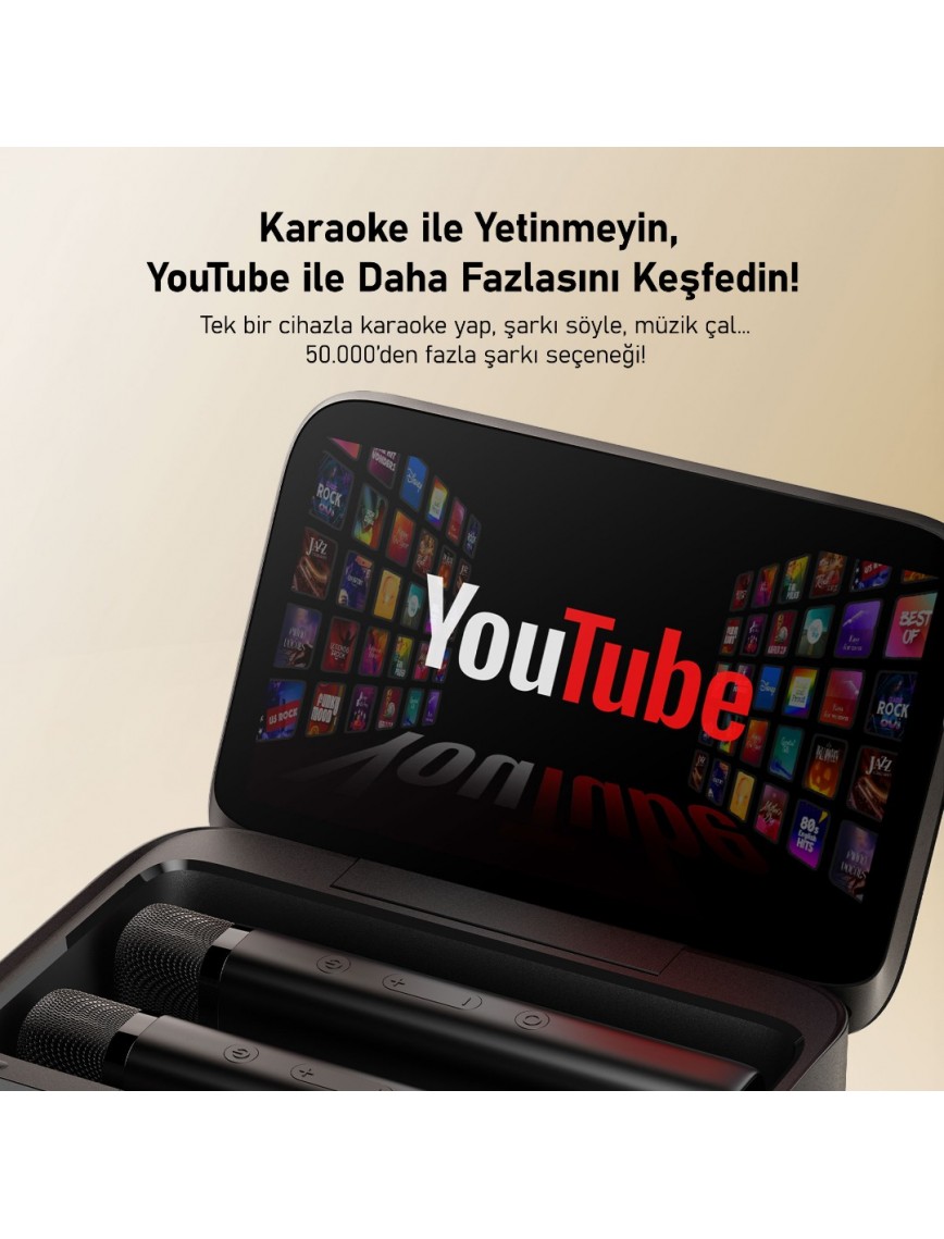 Ikarao Shell S3 Karaoke hoparlörü 50.000'den fazla şarkıya erişim sağlayan 6 aylık ücretsiz KaraFun Prime üyeliği ile birlikte gelir. Ek bir kuruluma gerek kalmadan dahili ekrandan şarkı sözlerini okuyabilir ve eğlenceli partiler yapabilirsiniz. KaraFun uygulamasının yanı sıra tablet ekranından YouTube ve diğer platformlardan da müzik akışı sağlayabilirsiniz.
